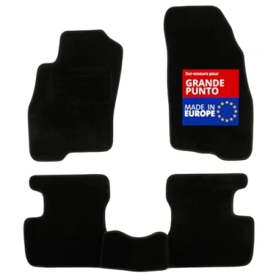 Custom-made for FIAT GranPunto (10/2005 to 2018) 2 car mats for front + 1 car mat with bridge for rear Exclusive anti-slip system : AUTOGRIP Original fixation clips Needled carpet 900g/m² - finish in velour: constructor quality