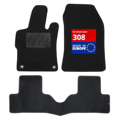 Premium option | Exclusive non-slip autogrip system + rear deck protection. In addition to the mounting clips, the driver's mat has an Autogrip adhesive surface to prevent the mat from slipping and interfering with your pedals. The rear mat is made of one piece, thus protecting the entire surface including the rear deck. Made to measure | Car mats with the exact dimensions of your car, European manufacture, 100% tailor-made, adapted to your Peugeot 308 from 10/2021 except electric and hybrid Set of 3 car mats | 2 front + 1 rear (complete protection rear bridge), easy and immediate installation. Finished with a black textile band for an elegant look. LONGEVITE | Durable thanks to its heat-sealed heel pad located on the most exposed part of the mat. CARPET | needle-punched carpet easy to maintain with water, appreciated by our customers for its quick daily cleaning.