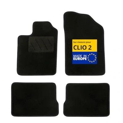 Made to measure. The mats are cut to the exact dimensions of your car. Precision European manufacture for a perfect fit adapted to your Renault Clio 2 (PHASE 2) and Campus (06/2001-10/2012). Safety: non-slip system combining strips and fixing clips for optimum stability. The mats stay in place without interfering with pedals. Complete set, set of 4 car mats (2 front + 2 rear). Quick and easy to apply. Stylish black textile finish for a beautiful integration into the interior. DURABILITY | Reinforced by a heat-sealed heel pad on the most stressed area. Designed to withstand everyday wear and tear. Carpet | Needled carpet resistant and simple to clean with water. Appreciated for its comfort and ease of care