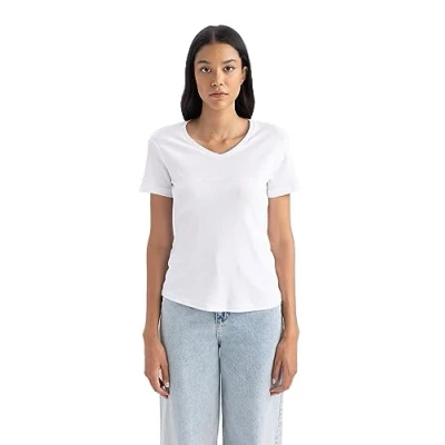 Trendy women's tops for the summer: perfect for the warm season High-quality women's V-neck shirt with classic cut: a timeless basic for any wardrobe. COMFORTABLE ALL DAY WEAR - The ideal T-shirt for everyday wear. Versatile: Whether casual with jeans or chic with trousers, this t-shirt will go with any look. FASHION DESIGN & HIGH QUALITY: DeFacto women's t-shirt is a must-have for fashion conscious women.