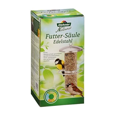 Feeding column made of rust-proof stainless steel with two seat rings, weatherproof With sturdy hanging loop for attaching to shrubs, shrubs or trees Ideal for a variety of bird feeds such as sunflower seeds, peanut seeds, scattered food, grease and soft food, grain and soft food Provides birds with a safe source of food at any time of year Box contents: Dehner Natura wild bird accessory feeder