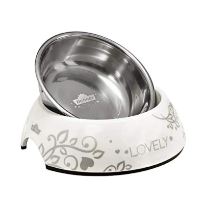 Dehner Premium Lovely Cat Bowl, Diameter 14 cm, Height 4.7 160 ml, Dishwasher Safe, Melamine/Stainless Steel/Rubber, White