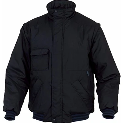 Bomber jacket with removable sleeves Knitted cuffs and bottom of garment 5 pockets Material: 65% polyester, 35% cotton Color: black