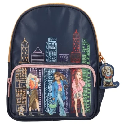 Equipped with a large main compartment, smaller inner compartment, front pocket and a side pocket Design: TOPModel City Girls by Depesche - In dark blue with model motif and skyline Lightly padded back and adjustable straps for a comfortable fit Dimensions: approx. 28 x 22 x 11 cm
