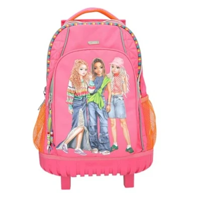Backpack for girls at school, leisure, travel and everyday life Design: TOPModel Joy by Depesche - in pink, with model motif and colourful details Equipped with 3 spacious compartments and 2 side pockets for umbrella and water bottle Features 2 smooth-running wheels, a telescopic handle for easy transport, padded straps and back, a back flap and a water resistant base Size: 52 x 32 x 25 cm. Weight: approx. 1770 g