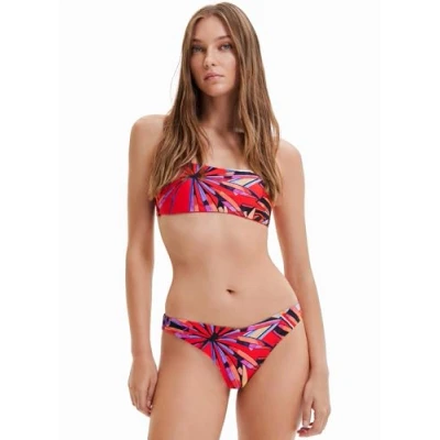 Clip closure in the back Removable cups Lined Durable fiber: recycled polyamide Desigual Playa Bikini Top 23SWMK28 Bandeau style bikini top with thin adjustable straps, embellished with a fermori in the back and a multicolored tropical print. Tropical leaf print with marker effect Bandeau neckline Straps