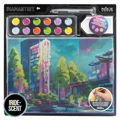 DIAMANTINY LEVEL UP: This is the crystal art activity to create DIY mosaics, embossed, with colorful 3D gemstones. Available in LANDSCAPE City Night to gem version. TECHNIQUE: To decorate the City Night landscape mosaic you need to use the "crystal art, color by numbers" technique, applying the gems to the numbers. The instruction sheet guides you through the application. FUNCTION: This activity is very simple and relaxing. Helps children and young people develop dexterity, coordination and concentration. Contents: the set contains 1 picture measuring 21 x 29.5 cm with adhesive base and colour guide, 3000+ coloured crystals, 1 binder tray, 1 pen with which to apply them and 1 square of wax. Recommended age: 8+, Manufacturer: Nice SRL