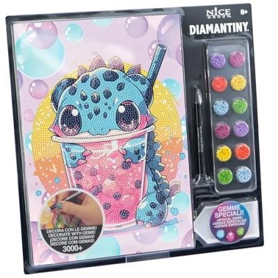DIAMANTINY LEVEL UP: This is the crystal art activity to create DIY mosaics, embossed, with colorful 3D gemstones. Available in BOBA TEA Dragon to gem version. TECHNIQUE: To decorate the mosaic of the Boba Tea Dragon you must use the technique "crystal art, color by numbers", applying the gems to the numbers. The instruction sheet guides you through the application. FUNCTION: This activity is very simple and relaxing. Helps children and young people develop dexterity, coordination and concentration. Contents: the set contains 1 picture measuring 21 x 29.5 cm with adhesive base and colour guide, 3000+ coloured crystals, 1 binder tray, 1 pen with which to apply them and 1 square of wax. Original Diamantiny product. Recommended age: 8+, Manufacturer: Nice SRL