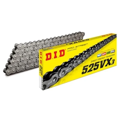 D.I.D is a manufacturer of drive chains and other products for the motorcycle and automotive industry. In addition to drive chains, the company also sells sprockets, chain kits and other drive elements that play an important role in improving the performance and safety of vehicles. DID's VX chain range features industry leading, patented X-Ring sealing technology that results in longer chain life. With minimal friction loss and overall excellent performance, the VX chain range is an excellent choice for motorcycles and other vehicles requiring a robust, reliable chain. Chain pitch: 525 Lock type: clip lock