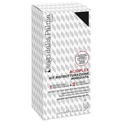 RESTRUCTURING SYSTEM: A professional two-step solution, quick and easy. It sublimates and strengthens all hair types, even weak and dull, with a glossy effect, without weighing it down. Ideal for coloured hair, revives colour. The two stages create an invisible protective film, smoothing and strengthening the fiber, for vital and soft hair. Visible results from the first use. BENEFITS: Renovated, shiny, elastic and protected hair. The mix of the two phases provides immediate intensive action. Creates an invisible protective film on the hair fibre, smoothing cuticles and closing scales, ensuring sublime strength, elasticity and softness. USE TIPS: 1. Add all the contents of step 1 into the vial of step 2. Shake well. 2. Moisten your hair, twist the top of the bottle cap to open the dispenser and apply all the contents of the mix directly to the hair; wear the cap that is in the package. Leave on for 15-20 minutes; 3. Rinse and proceed with shampoo and mask. PRIZE IMAGE PERFUMERI AT COSMOPROF: The Acidplex haircare line by diego dalla palma Milano received the Immagine Profumieri Award at Cosmoprof in 2024. DIEGO DALLA PALMA: Historic Italian brand known for its expertise in make-up, skincare and haircare, an all-round beauty company renowned for the high professionalism and performance of its products.