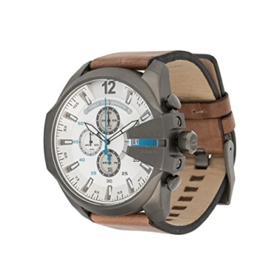 DIESEL men watch - Xlarge gunmetal round stainless steel case (diam. 59 mm) in polished and brushed finishing - 10 ATM water pressure resistance construction Light brown genuine leather strap - Buckle White two layer dial with grey and white indexes and gunmetal arabic digit at 12 o'clock - Chronograph movement with date - Black and white hands with blue seconds - Mineral glass Packed in DIESEL gift box
