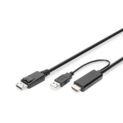 DIGITUS Active HDMI Adapter Cable to DisplayPort 2 m UHD 4k30Hz 1.4 DP 1.2 External Power Source USB A Plug & Play Black