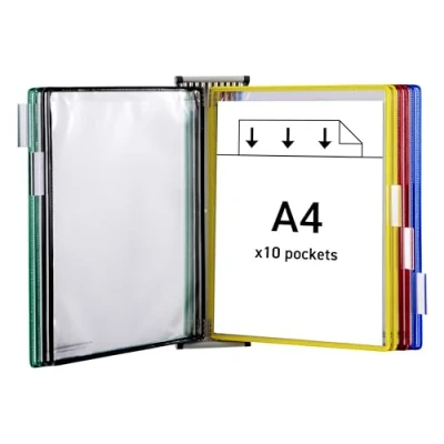AmazonA4 Wall Display Unit with 10 Assorted Pivoting Pockets Sturdy and easy to mount with fixings provided Efficiently communicates important information where it's needed Includes 5 Clip-On Index Tabs for Identification Light grey wall unit for document display Features 10 pockets in assorted colours Includes a kit for fixing to walls Pockets feature steel wire core for durability and long life Great for a range of documents