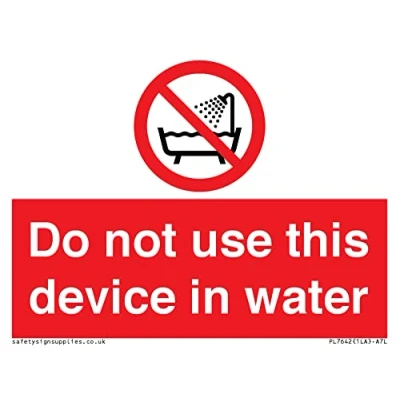 P026 : Do not use this device in a bathtub, shower, or water-filled reservoir This sign is made from vinyl / sticker Air Release vinyl makes it easy to stick to flat, clean surfaces without bubbles. Not for rough, plastic or dusty surfaces. A7 landscape Sign Text: Do not use this device in water