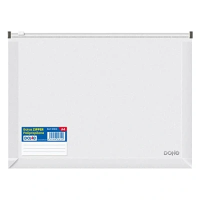 Landscape zip pocket made of transparent 180 micron polypropylene with top opening and a hermetic white plastic zip with metal reinforcement at the ends Expandable to 30mm width with front label. A4 landscape format expandable