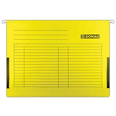 DONAU 7420905-11 Suspension File with Linen Frogs Interchangeable Blank Labels - Pack of 5 Made from cardboard with a weight of 230 GSM, ideal for office and school and the government Metal hanging handle for longer product life Equipped with side linen edges that prevent documents from falling out With movable index bookmarks and description boxes (with interchangeable blank labels). Capacity: 400 sheets in A4 format. Made from recycled cardboard. Material quality: 230 g. For paper format DIN A4. Format: A4, colour: yellow. With the green dot - participation in the recycling and recycling system, which results from the provisions of Polish and EU law