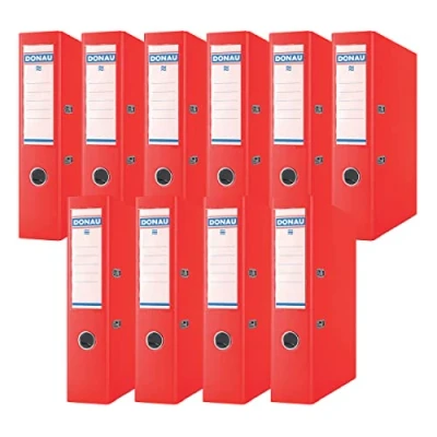 DONAU 3975001PL-04 - Premium Folder Wide / DIN A4 / 7.5 cm - 75 mm / Pack of 10 - 10 pieces. Colour: red High quality lever with pressure load Replaceable double sided back label Reinforced finger hole High-quality folder made of 2.1 mm thick cardboard with a grammage density of 1290 GSM, equipped with a lower reinforcement tape - A4/75 mm Folder, office folder, letter folder, spine width: 75 mm, dimensions: 75 x 320 x 285 mm, colour: red Green dot - participation in the recycling and recycling system, which results from the provisions of Polish and EU law Coated on both sides with ecological polypropylene film (100 µm), plastic cover PP/paper with the structure of a linen cloth