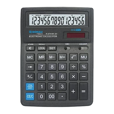DONAU Tech desktop calculator, with 16-digit display with solar and battery operation, compact design, high-quality workmanship, 5 year warranty Calculator: Large LCD display - The large buttons and convenient for note Size: 199 x 153 x 31 mm, colour: black, metal housing, packaging/box with hole for hanging With square root function and calculation of percentages Calculation of profit margins double zero, deletion of last entry data storage, decimals, rounding of values, currency conversion Automatic shutdown This applies to profit margins, for example. These calculators feature large buttons and a single-line display. These devices are inexpensive and make office work much easier With the Donau Tech brand, you will receive premium products that combine tradition with modern design as well as value for money with high quality and a 5-year warranty