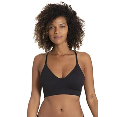Wirefree bralette in recycled mesh Slightly padded with removable pads for a lovely breast line V-neck cut for a feminine line Support provided by a wide underbust ribbed band Racer back and adjustable straps to keep the bra in place