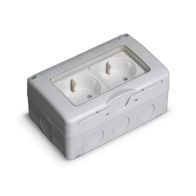 Double socket IP55 surface, waterproof and dustproof, ideal for outdoor industrial environments.