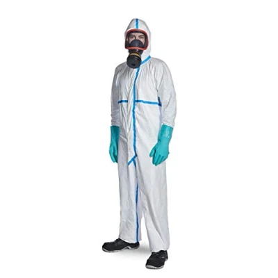 White, hooded coverall Robust, yet lightweight Adhesive Chin Flap Elasticated face, wrist and ankles Thumb Loops