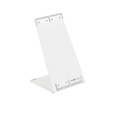 Article name: Table stand Number of display panels supplied: without display panels Piece Fastening technology: Pin mechanism Description of special features: L-shape Material: metal Use for A4 size display paper panels Made of plastic-coated steel L-shaped table stand Available in grey colour Measures 190 mm width by 295 mm height by 165 mm depth