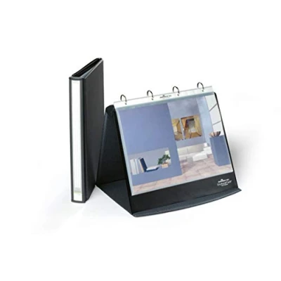 Article description: Table flipchart DURASTARBlack Number of sleeves: 10 pieces max, number of extension sleeves: 20 pieces Design of the storage mechanism: 4-ring mechanism Description of the special features: stable book body, head-stable due to reinforcement of the foil on the ring mechanism, spine with inscription field, during presentation the transparent covers are folded back