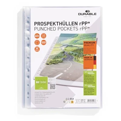 Box contents: perforated A4 transparent pockets, 40 pieces, extra strong document sleeves 80 µm Sustainable: made from at least 95% recycled plastic before use (industrial waste, cuttings or production residues) Functional: transparent DIN A4 transparent case with reinforced universal perforation for practical storage of unpunched documents in folders and ring binders Document proof document wallet made of premium quality polypropylene, open at the top Made in Germany. Durable is one of the leading German brand manufacturers of office organisation and presentation equipment