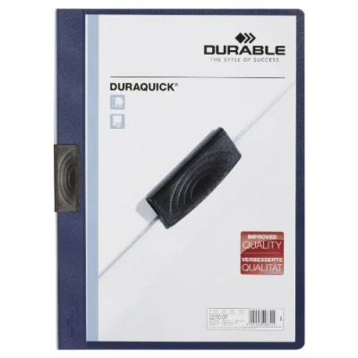 Plastic clip folder with front cover made of transparent soft foil, back cover made of coloured hard foil Stable, permanently elastic clamp made of special plastic Due to the flat construction of the clamp, the folder hardly Scope of delivery: Durable 227007 Duraquick A4 clip-on folder dark blue, 20 pieces Made in Germany. Durable is one of the leading German brand manufacturers of office organisation and presentation equipment