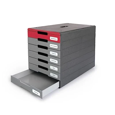 AmazonStorage box with 7 drawers for storing documents in DIN A4 (up to C4) format The Idealbox Pro drawer box carries the Blue Angel environmental label and is made from at least 80% post-consumer recycled material Stackable drawer organizer for desk, office and counter cabinets or shelves. Box dimensions: 250 x 322 x 365 mm (W x H x D) Smooth-running drawers with handle opening, can be swapped with each other Box contents: Durable storage system 776303 with 7 compartments made of sturdy plastic, including labellable adhesive labels