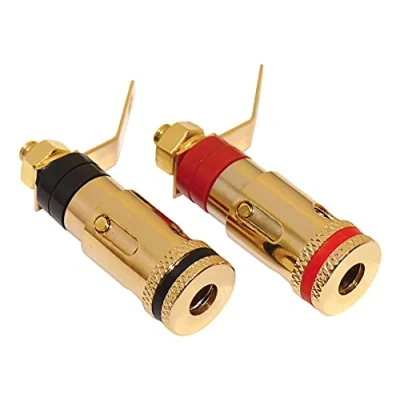 Amazon Gold-plated banana socket Cross connection with spring clamp up to 4 mm cable thickness Additional connection for 4 mm banana plugs Handle sleeve L 23 x diameter. 12 mm, solder connection, mounting thread diameter 3.8 mm, 14 mm long Set of 4, 2 x red, 2 x black