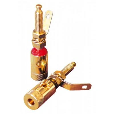 4mm gold banana socket for recessed 5mm cable. Sleeve L 21xdiam. 11mm 26mm length with 2 nuts and disc Soldering terminal. Set consists of 2 red spotted sockets and 2 black spotted sockets. Delivered in blister packaging.