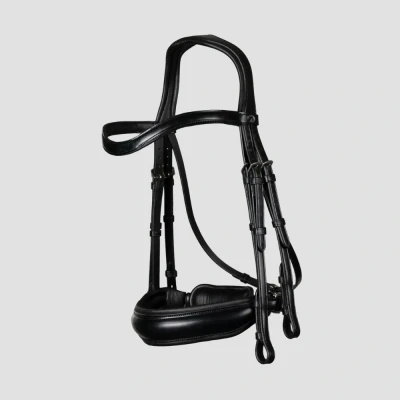 The Dy'on Matte Large Crank Noseband Double Bridle is a premium dressage bridle designed for both performance and comfort. Crafted from high-quality matte leather, it features a slightly raised, supple V-shaped browband and an anatomically shaped 38 mm wide noseband. The noseband is equipped with a pull-back closure mounted on a padded protective backing. The bridle also boasts a thin, soft headpiece with anatomic cutting to relieve pressure at the base of the ears, enhancing the horse's comfort during use. Key Features Browband: Slightly raised, supple V-shaped design. Noseband: Anatomical 38 mm wide crank noseband, available in matte leather, patent leather, or patent leather with white lining. Closure: Pull-back closure mounted on a padded protective backing. Headpiece: Anatomically shaped to relieve pressure at the base of the ears. Lining: Neoprene padding with extra soft full-grain sheep leather lining for enhanced comfort.