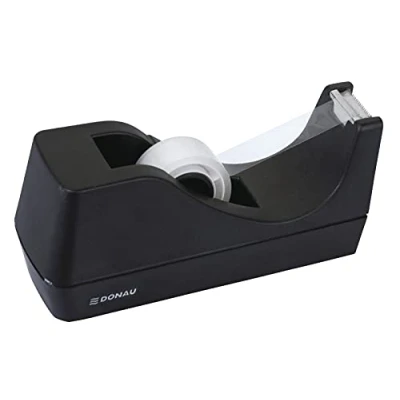 DONAU 7886001PL-01 Tape Dispenser: Colour: Black. Made of plastic Sturdy, weighted tape dispenser Designed for adhesive tapes with a maximum width of 19-24 mm and a maximum length of 33 m Ideal for the workplace or home Ergonomic shape allows you to tear off the tape with one hand Stainless steel serrated blade With non-slip underlay Easy to change the tape No tape is included in the box contents Colour: black