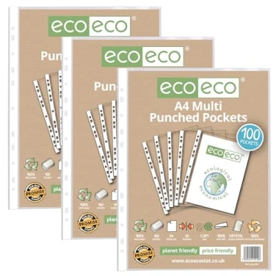 Strong 45 micron strength wallets, ideal for home, office and professional use These pockets securely hold A4 documents. 3 Packs of 100 pockets. 300 pockets total. Glass clear visibility with smooth finish. Multi-punched spine for universal filing Acid free and copy safe. Responsibly sourced materials and responsibly produced Made from 100% recycled materials, product and packaging both 100% recyclable