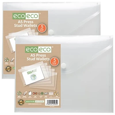 Strong 200 micron strength A5 size wallets, ideal for home, office and professional use These wallets securely hold A5 documents with a press stud closure. 10 wallets per single pack Clear visibility with smooth finish and superior strength. Acid free and copy safe Responsibly sourced materials and responsibly produced. Made from 95% recycled materials