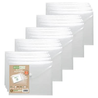 eco A5 50% Recycled Clear Transparent Press Stud Popper Wallet, Plastic Folders (Pack of 25) eco032x25
