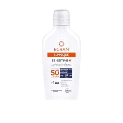 Ecran Sunnique Sensitive is a lightweight protective milk in spray format particularly suitable for sensitive and atopic skin. Superior formula x4 ants: sun allergies, itching, redness and dryness. Thanks to its unique formula with VitEox 80, it protects against UVA, UVB, infrared and sunburn while strengthening the skin's antioxidant defenses Ecran protective milk without perfume or alcohol is suitable for sensitive, very clear or sun intolerant skin. It has a biodegradable formula and comes in a handy 200ml spray format. Ecran Sunnique Sensitive 50+ protective milk for sensitive and sun intolerant skin incorporates Panthenol, an active active that deeply moisturizes the skin. Its spread in gun allows for convenient, quick and practical application Proven clinical efficacy. This non-comedogenic protective milk incorporates Panthenol and other irritating active ingredients into its formulation. In addition, it is water resistant