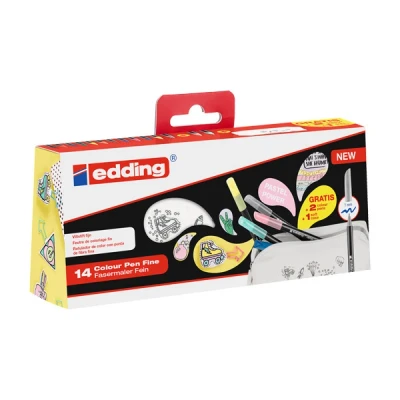 Fine felt-tip pen in pastel for light paper; the fade-resistant ink ensures long-lasting results and does not bleed through the paper The set contains the colours black, red, blue, green, yellow, orange, brown, purple, pink, light blue, silver grey, cherry blossom, honeydew melon and sweet mint. As well as a practical, paintable pencil case Easy and clean application for spontaneous creativity in bullet journals, mandalas or hand lettering; felt tip pens for school or leisure The fine bullet tip glides smoothly over the paper; ideal for comfortable and hassle-free writing, drawing and coloring; for kids and adults The edding felt tip pens are available in 30 colours; very easy to combine with the edding 55, edding 1300 and edding 1340