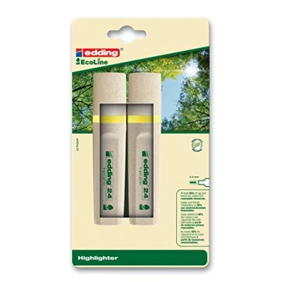 Product range: EcoLine. Product name: edding 24 Highlighter. Description of special features: cap and barrel made from at least 90% recycled material. Box is made from 80% recycled paper. Barrel colour: natural wood grain look.