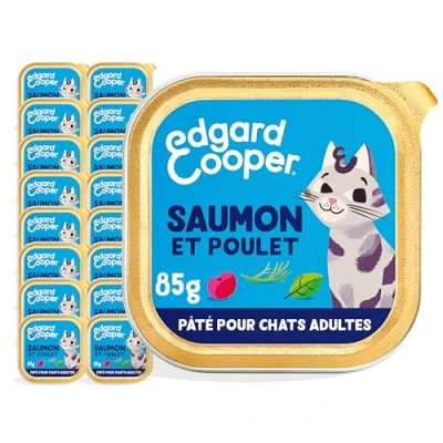 Natural wet food for adult cats, salmon and chicken pate, no processed or dried foods Suitable for all adult cats, of all sizes and breeds, neutered and active Wet cat food grain-free and gluten-free for sensitive stomachs, with prebiotics for intestines Natural food made from lean proteins that strengthen the immune system, bones and muscle No artifices or added sugars in our recipes Upgrade to Edgard & Cooper by gradually increasing the amount of new food and decreasing the amount of the old brand over 10 days