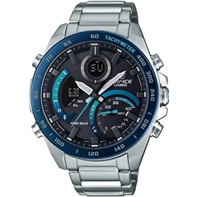 This solar powered watch recharges itself in any kind of light,This solar watch does not require any battery replacement. -The watch has a calendar function: Day-Date, Solar Powered, Bluetooth, Stop Watch, Worldtime, Alarm High quality 21 cm length and 21 mm width Silver Stainless steel strap with a Fold over with push button clasp Case diameter: 44 mm,case thickness: 14 mm, case colour: Silver and dial colour: Blue Water resistant: 10 bars -Weight: 166 g The watch is delivered in an original gift box and has a warranty of 2 years