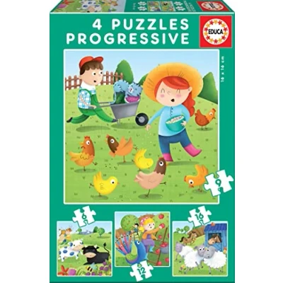 Set of 4 progressive puzzles of 6, 9, 12 and 16 pieces Farm Animals Inspired Puzzles Composed of large pieces, perfectly finished so that it is simple and safe to handle by children The puzzles stimulate the fixation of attention as well as the development of psychomotor skills, curiosity and imagination of the little ones Recommended for ages 3 and up, Manufacturer: Educa Borrás