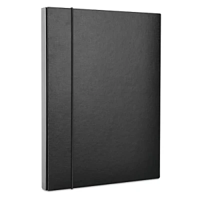 extended file folder; coated in eco-friendly PP foil; spine width: 40mm; format: A4 made of hardened cardboars with a thickness of 2mm white inner coating; capacity: about 230 sheets, 80 gsm; with round black elastic band along the file for closure; two short sides made of plastic, milky colour;