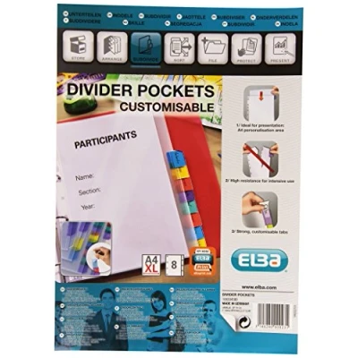 Size: A4+ Material: polypropylene Number of dividers: 8 Dual function: punched pockets to protect documents A4 + tab to organize your ranking. Comes with pre-cut Bristol label sheets. Perforation ripstop. Personalised with