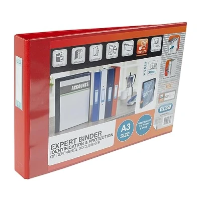 A3 PVC-Covered board ring binder: Quality PVC over strong board for durability 4 D-Ring mechanism: Standard 4 D-Ring mechanism to hold loose papers 55 mm spine with 30 mm capacity: With a 30 mm capacity this folder will hold up to 300 sheets Transparent front and spine pocket: Ideal for training manuals and other documents, the side loading pocket on the front allow for easy personalisation Elba strongline: 5 years guarantee