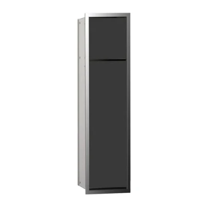Invisible storage space: the flush-mounted bathroom cabinet offers practical storage space without taking up space in the bathroom and is particularly easy to install. Functional design: the durable aluminium body, the practical toilet paper dispenser and the "push to open" function make the bathroom shelf a favourite piece. High-quality look: the divided glass front in black is a subtle eye-catcher and fits perfectly into the bathroom thanks to flush installation and handle-free look. ASIS 150: The ASIS 150 module series is characterised by its particularly narrow products that enhance any bathroom with shiny fronts and create valuable storage space. Dimensions & details: emco ASIS 150 Bathroom Cabinet for Toilet Paper and Toilet Brush Set 2 Door Glass Front in Black Dimensions: 16.8 cm x 65.4 cm x 15.3 cm (W x H x D); Item Number 974027940.