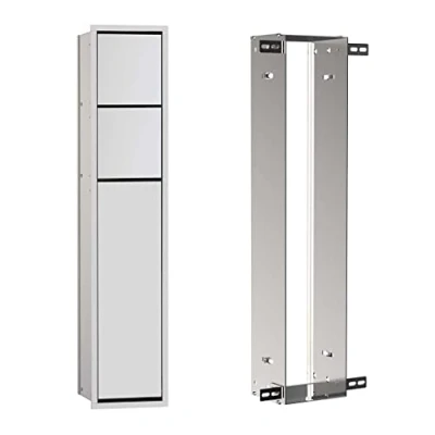 The bathroom all-rounder: the bathroom cabinet as a flush-mounted model offers storage space for all toilet utensils, without taking up space in the bathroom and is particularly easy to install. Practical design: with innovative toilet paper dispenser, toilet brush holder and extra compartment, everything is hidden in one spot and discreetly in the wall. High-quality look: the multi-divided front in anodised silver is a subtle eye-catcher and fits perfectly into the bathroom thanks to flush installation and handle-free look. With mounting frame: the mounting frame ensures quick, secure and precise installation. During the construction phase, it serves as a placeholder and also as a stop aid for tilers. Dimensions & details: Emco Asis bathroom cabinet with mounting frame; multi-door anodised in silver; right-hand hinge; dimensions: 16.8 cm x 80.9 cm x 15.3 cm; frame dimensions: 17.4 cm x 80.5 cm x 15 cm; item number 4018445137577.