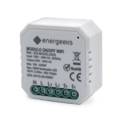 WIFI SWITCH MODULE: The energeeks MODILU002 WiFi switch module is designed to domotize the lights of any room with simple installation in the light register. This device allows convenient remote on/off of your lights, making it easy to automate and improve energy efficiency in your home. SMART LIGHTING CONTROL: With the WiFi switch module, you can control your home lights from anywhere using the energeeks 3.0 app. Schedule timers and automate the lights on and off according to your needs, improving comfort and safety in your home. GOOGLE AND ALEXA COMPATIBILITY: energeeks WiFi switch module is compatible with Google Assistant and Amazon Alexa, allowing you to control your lights using voice commands. Just say "Alexa, turn on living room lights" or "Hey Google, turn off kitchen lights" to manage your home lighting efficiently and modernly. SIMPLE AND ECONOMICAL: The installation of the MODILU002 WiFi switch module is quick and simple, taking place directly in the light register. Its use is intuitive through the free energeeks 3.0 app, available on the App Store and Google Play. This device is an economical and practical solution to improve lighting automation and control in your home. TECHNICAL SPECIFICATIONS: The energeeks WiFi switch module supports a maximum power of 2,300 W, providing a robust and reliable solution for lighting control. With the energeeks 3.0 app, you can manage and schedule the operation of your lights from anywhere. In addition, it features voice recognition via Google Assistant and Amazon Alexa, making it easy to control smart and modern your home.