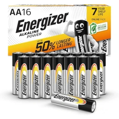 Up to 50% Longer Lasting Power* – Energizer Alkaline Power 1.5V AA Batteries (Pack of 16) deliver dependable, long-lasting energy for your everyday devices. Long Lasting Power for Your Favourite Devices – Ideal for remotes, toys, flashlights, clocks, wireless accessorie, and more. Get strong, consistent performance across home, office, and outdoor electronics. No Leak Guarantee – Designed with leak-resistant technology to protect your valuable devices, even when batteries are fully used. Long Shelf Life & Durable Power – An Energizer Alkaline Power Double A battery holds power for up to 7 years in storage. Power you can rely on when it matters most. Plastic-Free & Recyclable Packaging – 100% recyclable, plastic-free** packaging. Each battery includes up to 10% recycled steel—part of Energizer’s commitment to sustainability. Trusted Quality from a Leading Brand – From the makers of the world’s first zero-mercury AA battery***. Energizer Alkaline Power is free from mercury, cadmium and lead—for safe, reliable power. *vs IEC standard minumum average duration in protable lights. **(excluding seals on select packaging). ***commercially available in the world, back in 1991.